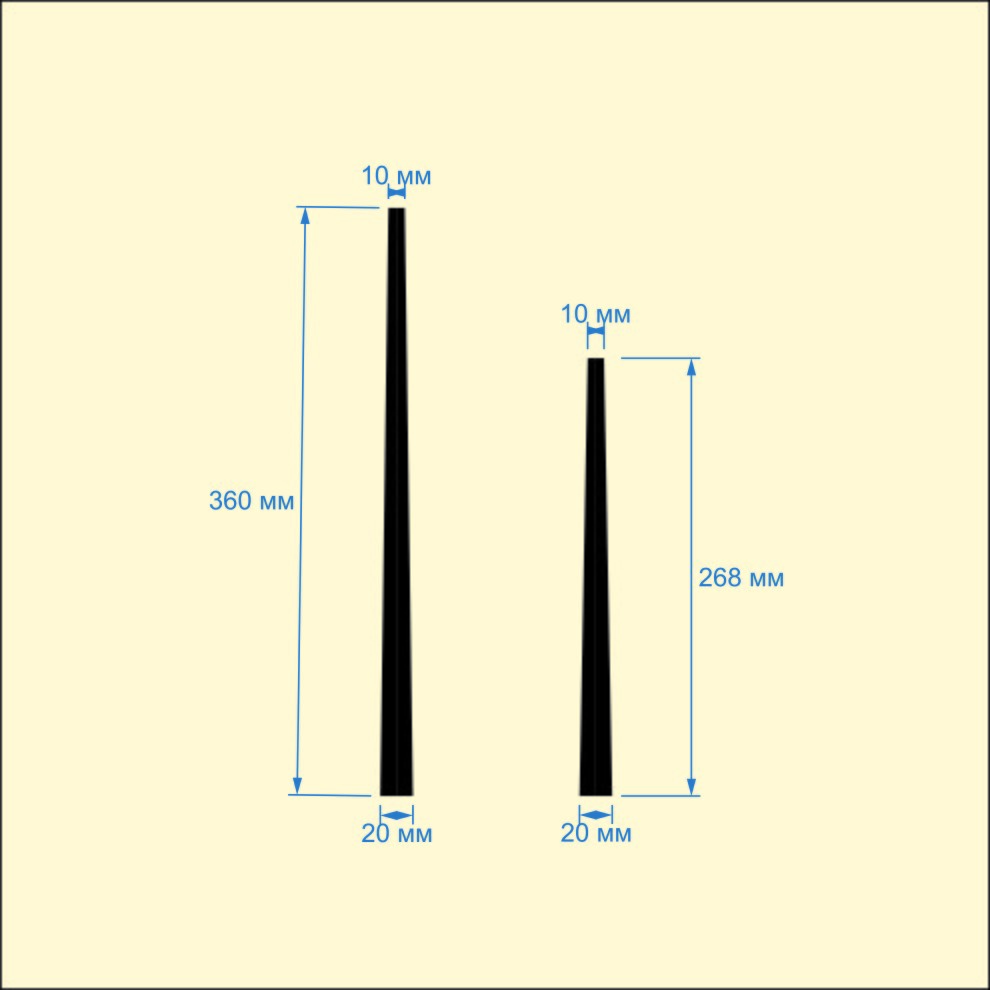 - трапециевидная форма: внешние габариты часовой стрелки: 270х20 мм, минутной: 360х20 мм