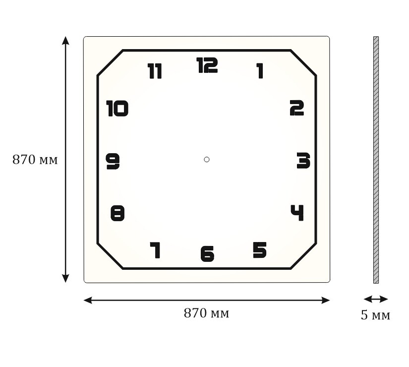 Изготовлен из акрилового стекла толщиной 5 мм с прочным корпусом для уличной эксплуатации. Размеры циферблата: 87 × 87 см, оптимально подходит для крупных уличных инсталляций.